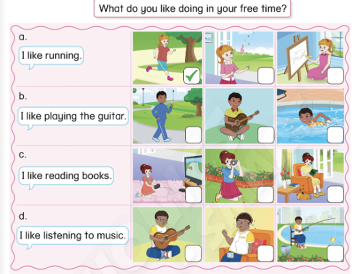 c. I like playing the guitar in my free time. (Tôi thích chơi đàn ghi-ta vào thời gian rảnh.)