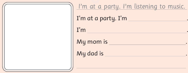 Match. Look at the picture. Fill in the correct circle and write.. Write the missing letters. Say the words . Listen and write. Circle the things you can see people doing at a party. Ask and answer about your family at a party.