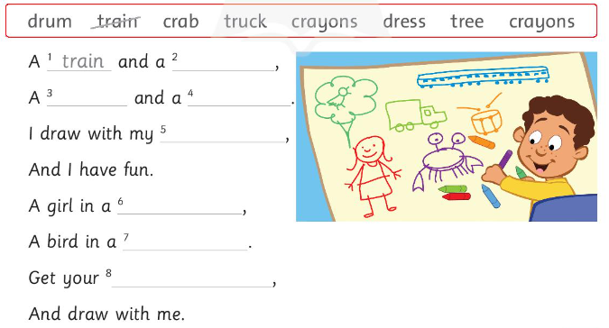 I draw with my crayons(Tôi vẽ với những chiếc bút sáp màu,)