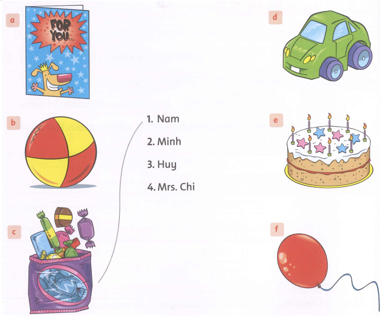(Nghe và ghép. Có hai hình ảnh thừa.)