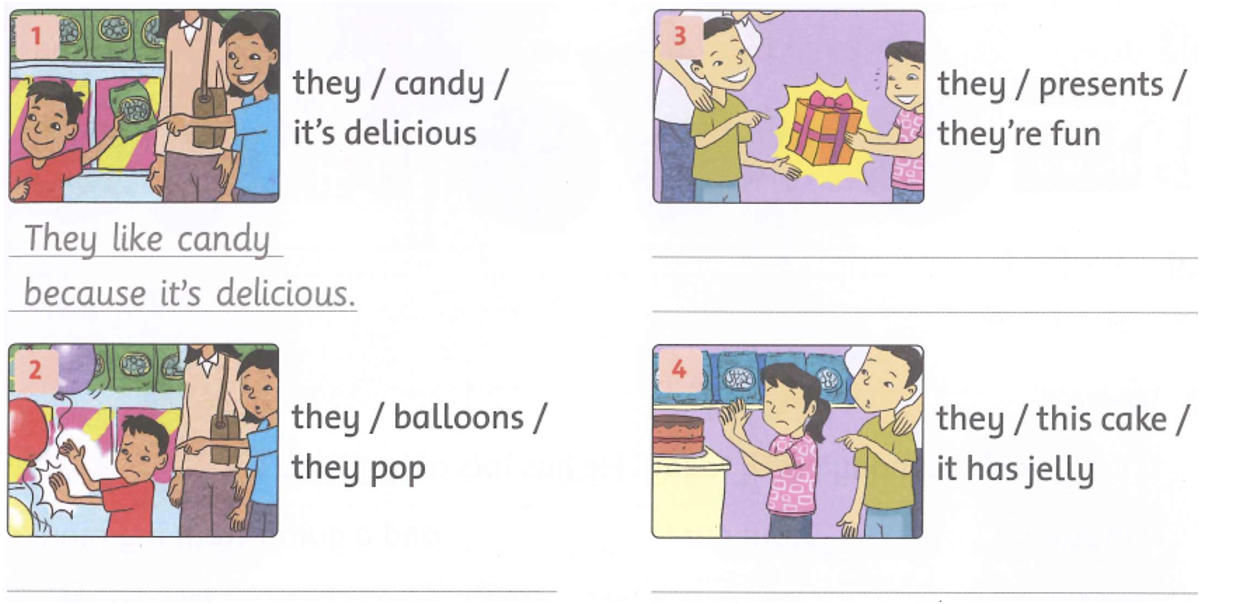 (Nhìn tranh và viết câu. Dùng like và các từ.)