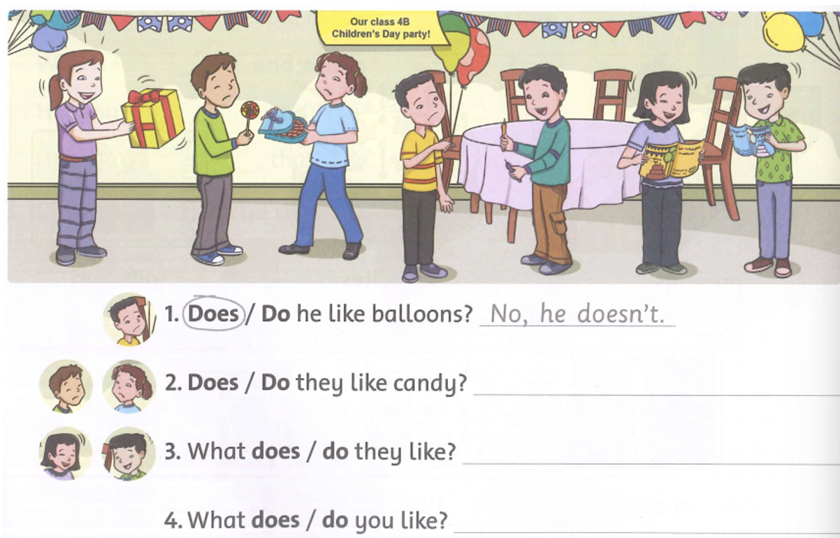 1. Does he like balloons? (Anh ấy có thích bóng bay không?)