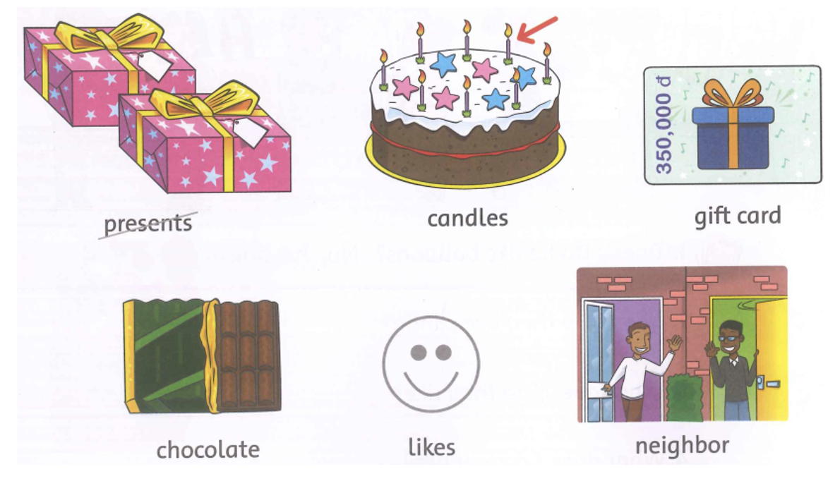 It’s my dad’s birthday party today! He has lots of (1) presents – a music (2) gift card from our (3) neighbor and a guitar from my mom. Dad (4) likes his presents a lot!