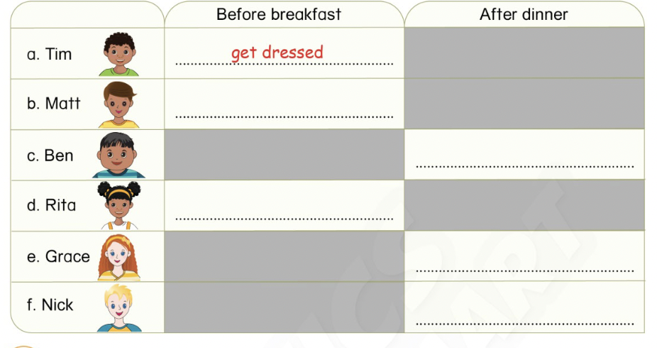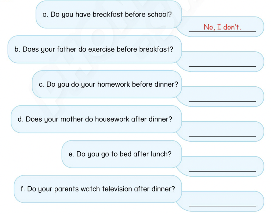(Không. Tôi làm bài tập về nhà trước bữa tối. Tôi giúp mẹ rửa bát sau bữa tối.)