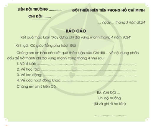 Bạn Lượt cần báo cáo công việc với ai. Bạn Lượt đã làm những việc gì để chuẩn bị báo cáo. Đọc mẫu báo cáo sau và trả lời câu hỏi. Để viết báo cáo trên, cần làm những việc gì. Em hãy đóng vai phân đội trưởng, tổ chức cho các bạn thảo luận về việc xây dựng chi đội vững mạnh trong tháng và ghi lại kết quả thảo luận để chuẩn bị báo cáo.