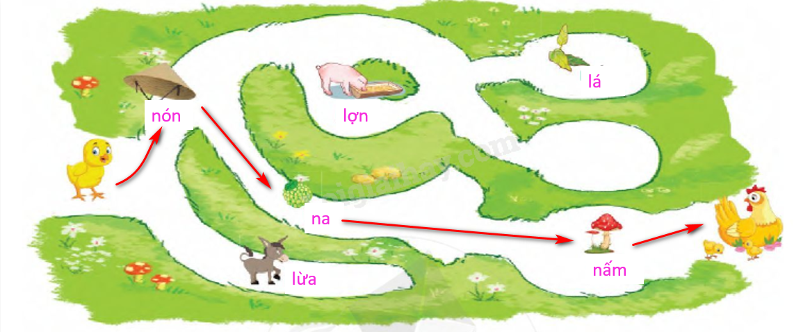 Em quan sát kĩ bức tranh và tìm đường về cho gà con bằng cách điền chữ l và n vào ô trống phù hợp.
