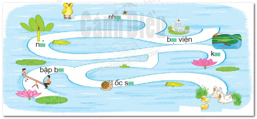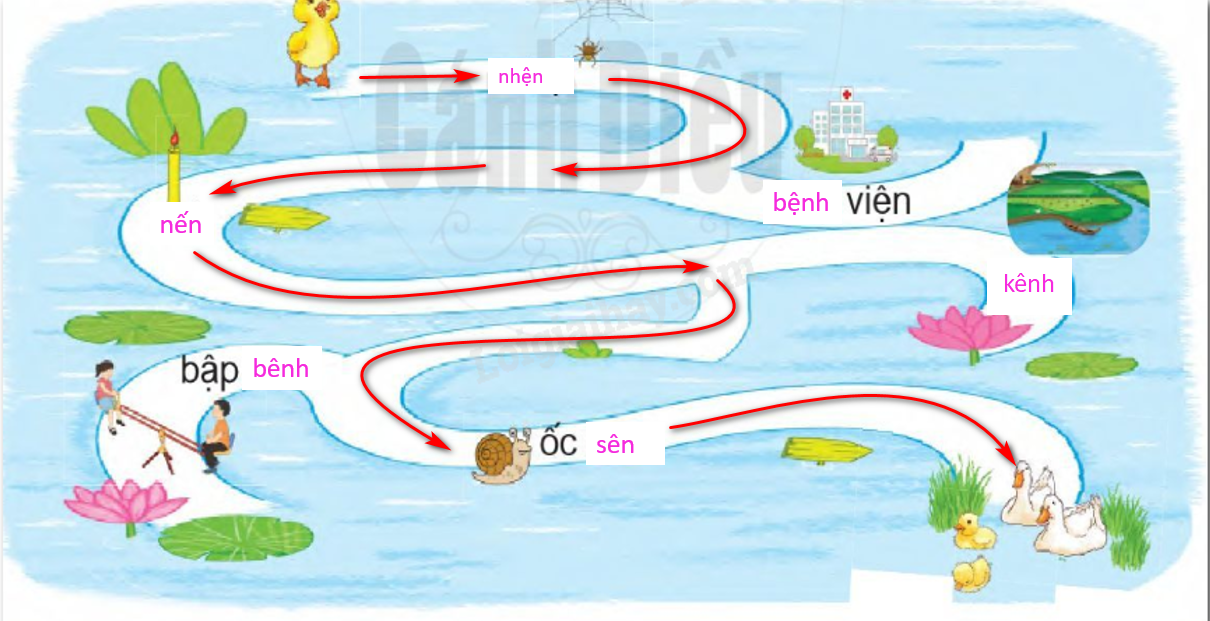 b. Em chọn vần (ên hoặc ênh) phù hợp với ô trống. Giúp vịt con tìm đường về với mẹ, biết rằng đường về được đánh dấu bằng các tiếng có vần ên.