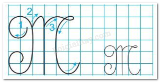 – Nét 3: Từ điểm dừng bút của nét 2, lia bút lên đoạn nét móc ở đường kẻ 5. Viết nét lượn ngang rồi chuyển hướng đầu bút trở lại để viết tiếp nét cong trái. Dừng bút ở đường kẻ 2.