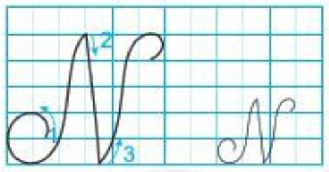 + Bước 4: Không nhấc bút, viết nét móc ngược phải, dừng bút trên ĐK dọc 4, giữa ĐK ngang 1 và 2.