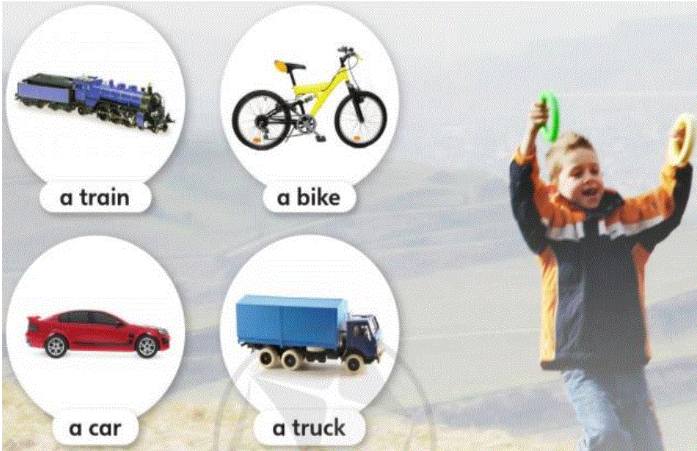 Cách chơi: Dán các bức tranh lên bảng (bike, car, truck, train). Một bạn sẽ ra lệnh, một bạn sẽ nhìn và