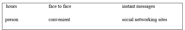 Nowadays, teenagers seem to communicate with their peers more on electronic devices than in (1) person. They chat with their friends using messaging applications and (2) social networking sites. They chat about almost everything, from homework and games to music trends. Their conversations tend to be short but can last for (3) hours. Many teenagers prefer this way of communicating to talking (4) face to face. They say that it is more (5) convenient and they can do many things while chatting. They may be exchanging (6) instant messages with several friends and playing their favourite games at the same time.