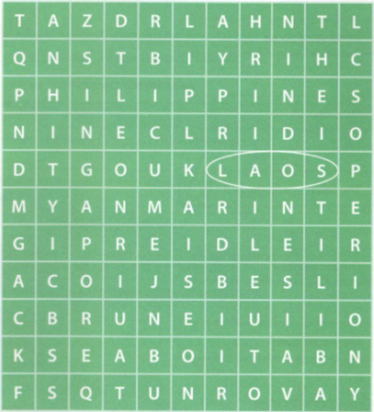 Look for the names of five more ASEAN countries in the word puzzle. Write them down in the spaces below.