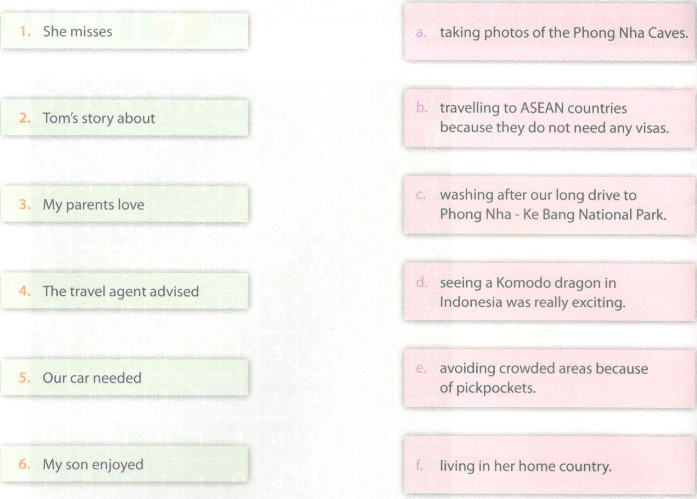 (Nối 1-6 với a-f để tạo các câu có ý nghĩa.)