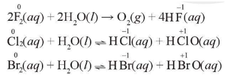 Đơn chất halogen thể hiện tính oxi hóa. Ngoài ra, ngoại trừ fluorine, các halogen còn lại có thể thể hiện tính khử khi tham gia phản ứng