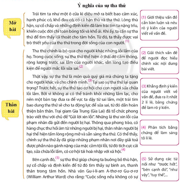 + Thân bài: giải thích vấn đề cần bàn luận; đưa ra được ít nhất hai lí lẽ cụ thể để lí giải cho ý kiến của người viết; sắp xếp các lí lẽ, bằng chứng theo trình tự hợp lí; đưa ra được bằng chứng đa dạng, cụ thể, tiêu biểu, xác thực để làm sáng tỏ lí lẽ; xem xét vấn đề từ nhiều phía để nội dung bài viết được toàn diện.