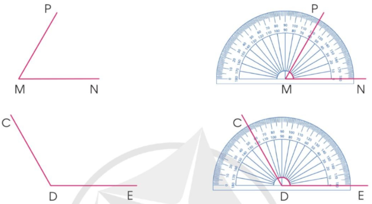 – Xác định xem cạnh còn lại đi qua vạch chia độ nào thì đó chính là số đo của góc.