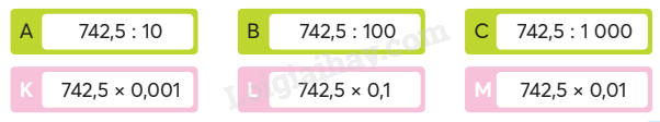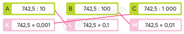 Tính nhẩm. a) 42,7 : 10 61,3 : 100 76,5 : 1 000 b) 0,9 : 0,1 21,6 : 0,01 8 : 0,001 Chọn các cặp biểu thức có giá trị bằng nhau.