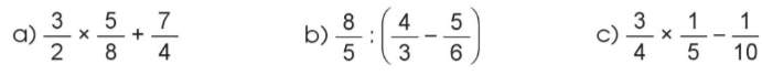 c) $\frac{3}{4} \times \frac{1}{5} – \frac{1}{{10}} = \frac{3}{{20}} – \frac{1}{{10}} = \frac{3}{{20}} – \frac{2}{{20}} = \frac{1}{{20}}$
