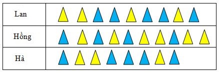 Quan sát biểu đồ ta thấy Lan cắt được \(4\) tam giác màu vàng, Hồng cắt được \(6\) tam giác màu vàng, Hà cắt được \(3\) tam giác màu vàng.