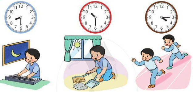 Quan sát tranh và đồng hồ rồi xác định thời gian thích hợp.