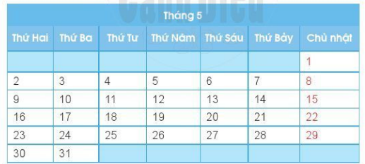 c) Trong tháng 5 có mấy ngày Chủ nhật ? Đó là những ngày nào?