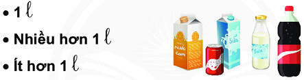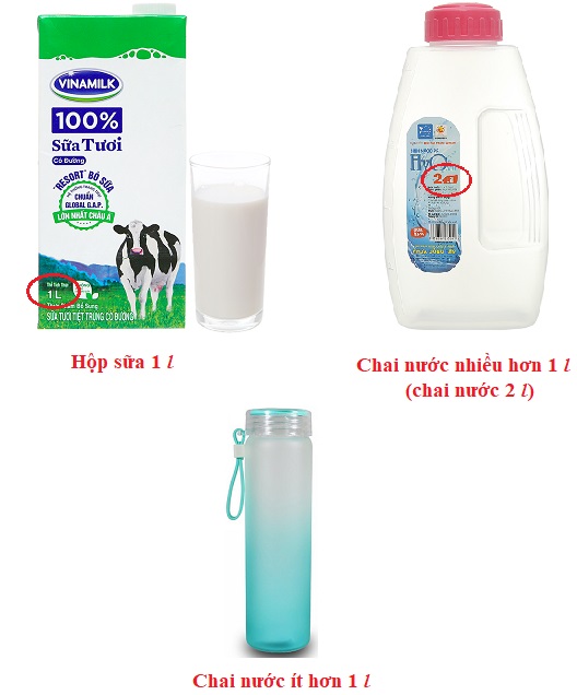 Em dùng các chai nước, hộp sữa, … và xem dung tích của mỗi loại, sau đó so sánh để xem dung tích đó bằng 1 \(l\), nhiều hơn 1 \(l\) hay ít hơn 1 \(l\).