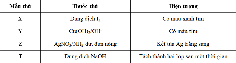 Y + Cu(OH)2/OH tạo màu tím nên Y là peptit có từ 3 aminoaxit trở lên ⇒ Y là lòng trắng trứng ⇒ loại B
