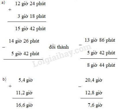 a) 12 giờ 24 phút + 3 giờ 18 phút               b) 5,4 giờ + 11,2 giờ