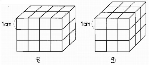 Quan sát hình vẽ để tính số hình lập phương nhỏ của mỗi hình. Hình nào có nhiều hình lập phương nhỏ hơn thì có thể tích lớn hơn.