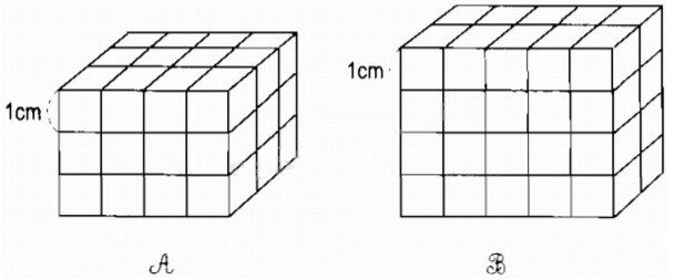 Quan sát hình vẽ để tính số hình lập phương nhỏ của mỗi hình. Hình nào có nhiều hình lập phương nhỏ hơn thì có thể tích lớn hơn.