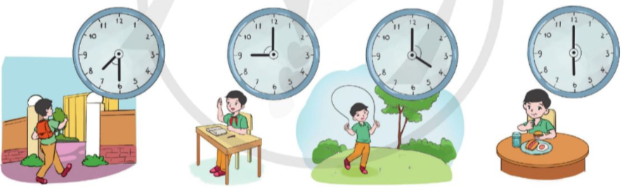 a) Quan sát các đồng hồ ở hình dưới đây, cho biết góc tạo bởi kim giờ và kim phút là góc vuông, góc  tù, góc bẹt hay góc nhọn: