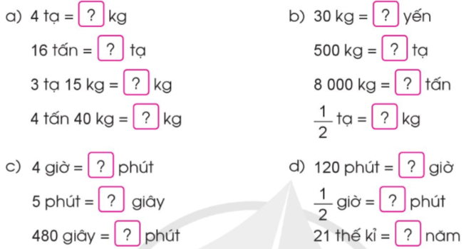 1 tạ = 100 kg ; 1 yến = 10 kg