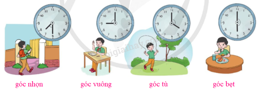 a) Quan sát các đồng hồ ở hình dưới đây, cho biết góc tạo bởi kim giờ và kim phút là góc vuông, góc  tù, góc bẹt hay góc nhọn:
