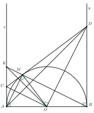 b) Gọi K là giao điểm của BM và Ax. Chứng minh \(\Delta KMO \sim \Delta AMD\)