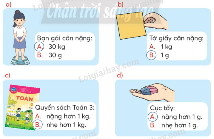 Quan sát tranh và khoanh vào g hay kg cho thích hợp.