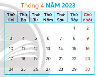 • Tháng 4 năm 2023 có 5 ngày Chủ nhật là: 2; 9; 16; 23; 30.
