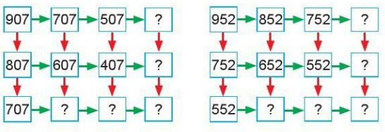 b) Quan sát các hình vẽ ta thấy hai số đứng cạnh nhau trong hàng ngang, hàng dọc sẽ hơn kém nhau 100 đơn vị hoặc 200 đơn vị. Từ đó ta điền được các số còn thiếu.