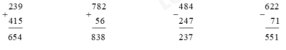 239 + 415                    782 + 56                      484 – 247                    622 – 71