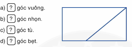 Dùng ê ke kiểm tra rồi nêu tên các góc vuông, góc nhọn, góc tù, góc bẹt trong hình bên.