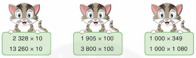 Khi nhân một số với 10, 100, 1000, … ta chỉ việc viết thêm một, hai, ba, … chữ số 0 vào bên phải số đó.