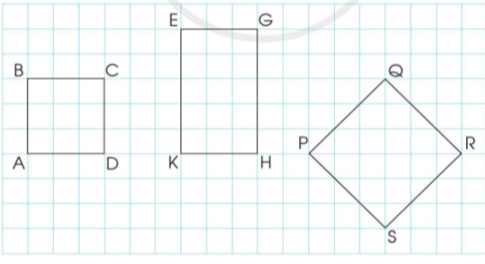 Đọc tên các hình vuông có trong hình dưới đây: Dùng ê ke và thước thẳng kiểm tra xem mỗi hình sau có phải hình vuông hay không.