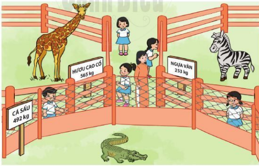 a) Quan sát tranh, so sánh cân nặng của cá sấu, ngựa vằn, hươu cao cổ để tìm con vật nặng nhất.