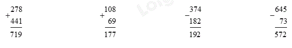 278 + 441                    69 + 108                      374 – 182                    645 – 73