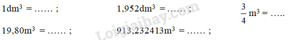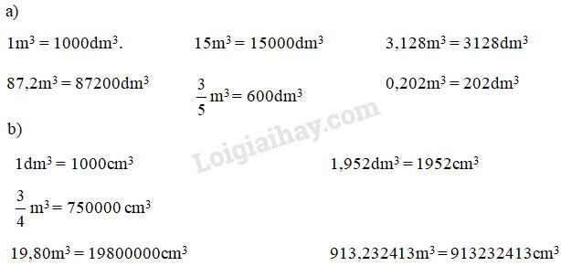 – 1dm3 = 1000cm3, do đó để đổi một số từ đơn vị đề-xi-mét khối sang đơn vị xăng-ti-mét khối, ta chỉ việc nhân số đó với 1000.