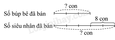 Trong ngày Quốc tế Thiếu nhi, một cửa hàng bán đồ chơi đã bán số búp bê bằng  $\frac{3}{5}$ số siêu nhân và ít hơn số siêu nhân 8 con. Tìm số búp bê và số siêu nhân đã bán.