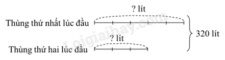 Bác Hai dựng nước trong hai thùng. Lượng nước chứa trong thùng thứ nhất bằng $\frac{5}{3}$ lượng nước trong thùng thứ hai. Sau khi chia đều lượng nước đó ở cả hai thùng thì mỗi thùng đều chứa 160 l nước. Vậy lúc đầu: