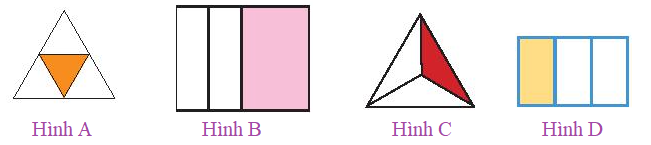 Hình được tô màu $\frac{1}{3}$ là hình được chia thành 3 phần bằng nhau và tô màu 1 phần.