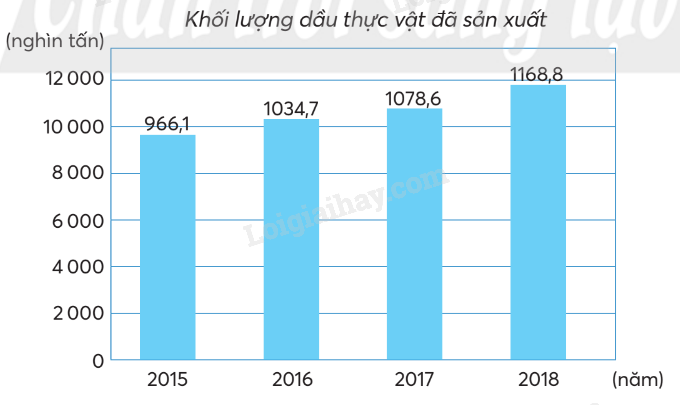 Dưới đây là biểu đồ cho biết khối lượng dầu thực vật được sản xuất ở nước ta từ năm 2015 đến năm 2018. Trong khoảng thời gian này, trung bình mỗi năm nước ta sản xuất .?. nghìn tấn dầu thực vật.