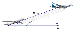 Nếu máy bay chuyển động theo hướng đó đi được 10 km đến vị trí B thì mất mấy phút?(làm tròn đến phần chục). Khi đó máy bay sẽ ở độ cao bao nhiêu kilômét so với mặt đất (BH là độ cao)? (độ cao làm tròn đến hàng đơn vị)