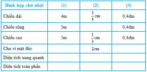 Tính diện tích xung quanh và diện tích toàn phần của hình hộp chữ nhật có: